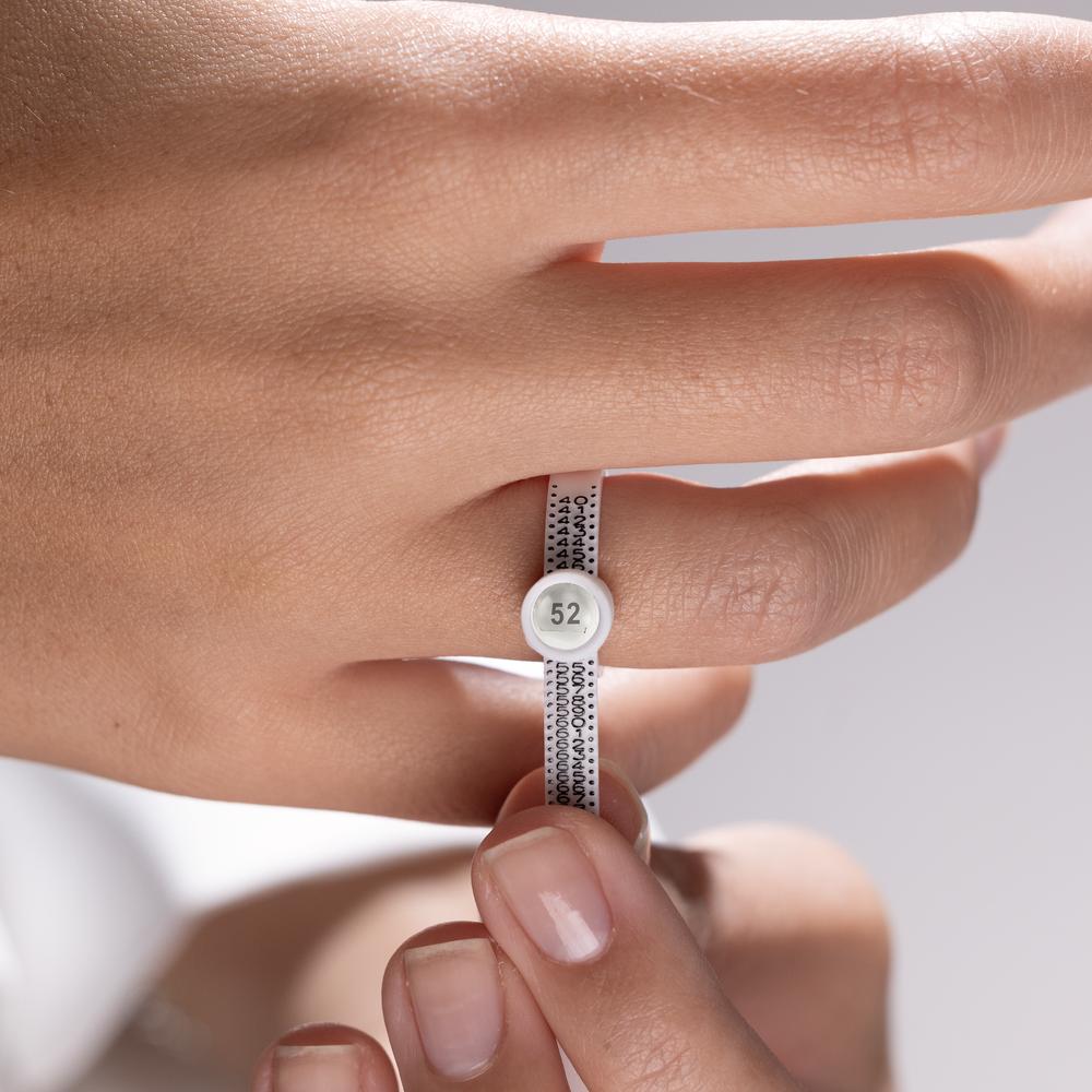 Der Multisizer ist ein flexibles Massband, das du um den Finger legst und vorsichtig festziehst, bis es bequem sitzt. Es sollte nicht zu eng sein, damit du es ohne Druck wieder abstreifen kannst. Die Grösse kannst du direkt im Sichtfenster ablesen. Diese Methode eignet sich ideal für eine erste Einschätzung.